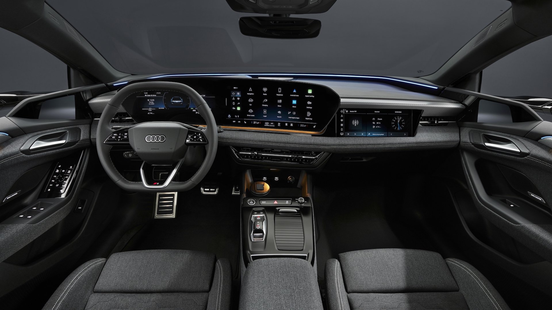 Speaking of the Q6, the Audi A6 is based on the same mechanical bits as that car, so it shares a lot of its technology, including the fantastic big screen setup inside. A big panel runs behind the steering wheel and across the dashboard and houses two massive screens. The graphics are sharp and it’s really responsive, though a little clunky to figure out where everything is.
