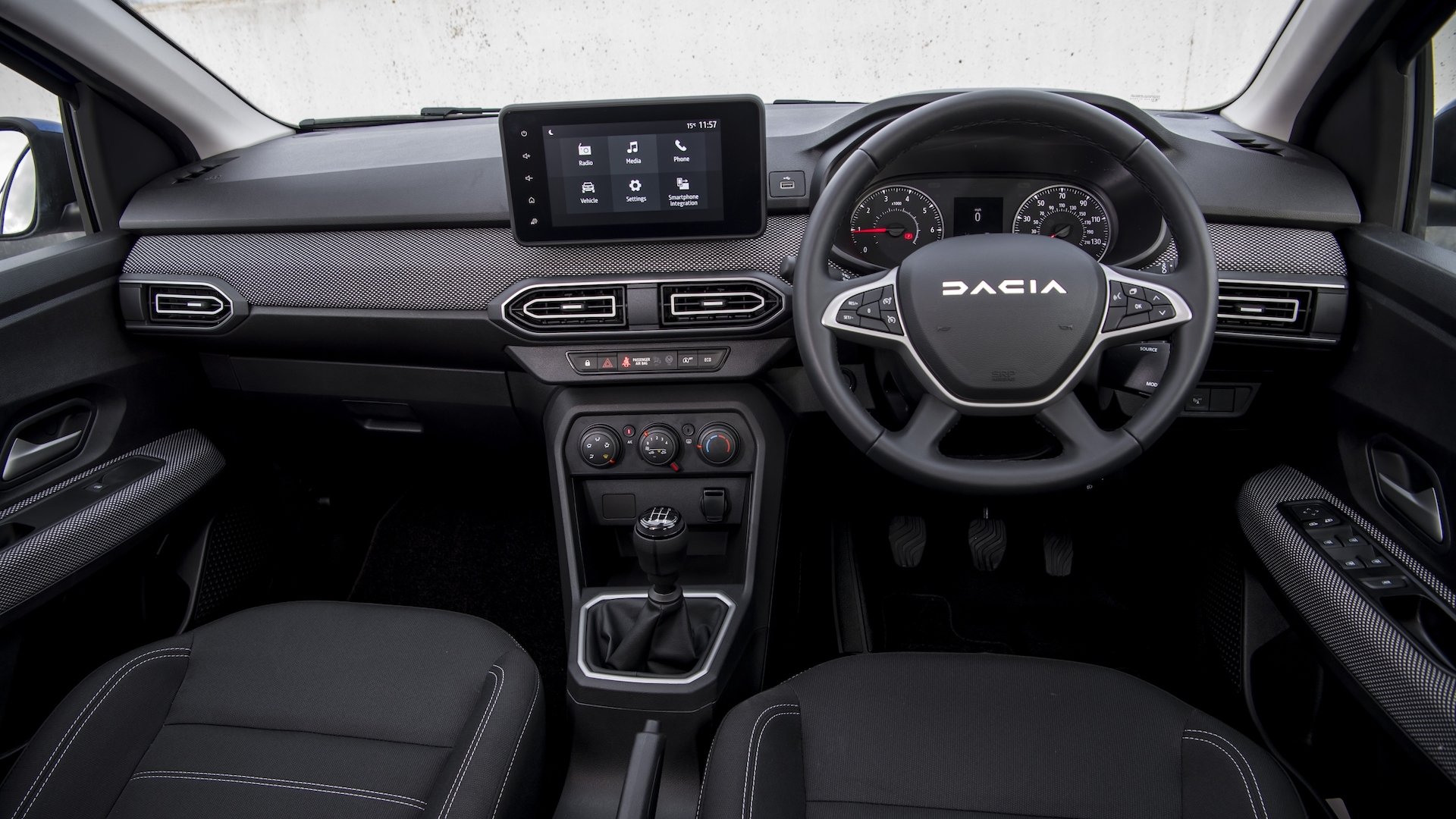A modern interior and some stylish touches belie the Sandero’s budget market positioning, but there's no hiding the sea of black plastics