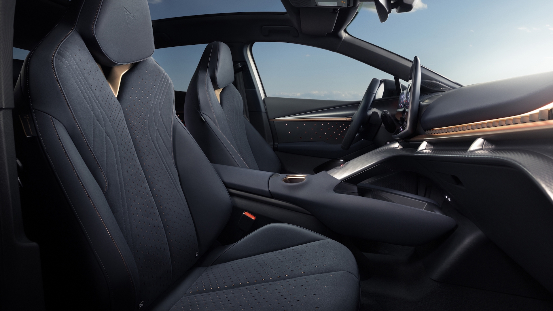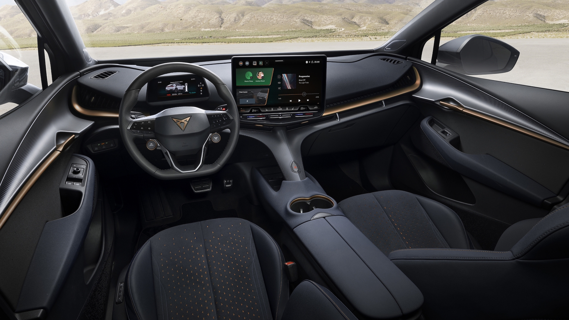 If you think car interiors are getting boring, the Cupra Tavascan is here to offer you a welcome reprieve. There’s a lot going on, with a sweeping line of copper splitting the dashboard horizontally across the car and running through the doors, with a mixture of dark and light materials either side. The way the centre console shoots up beneath the main screen is like little else, and the striking design is backed up by largely quality materials.